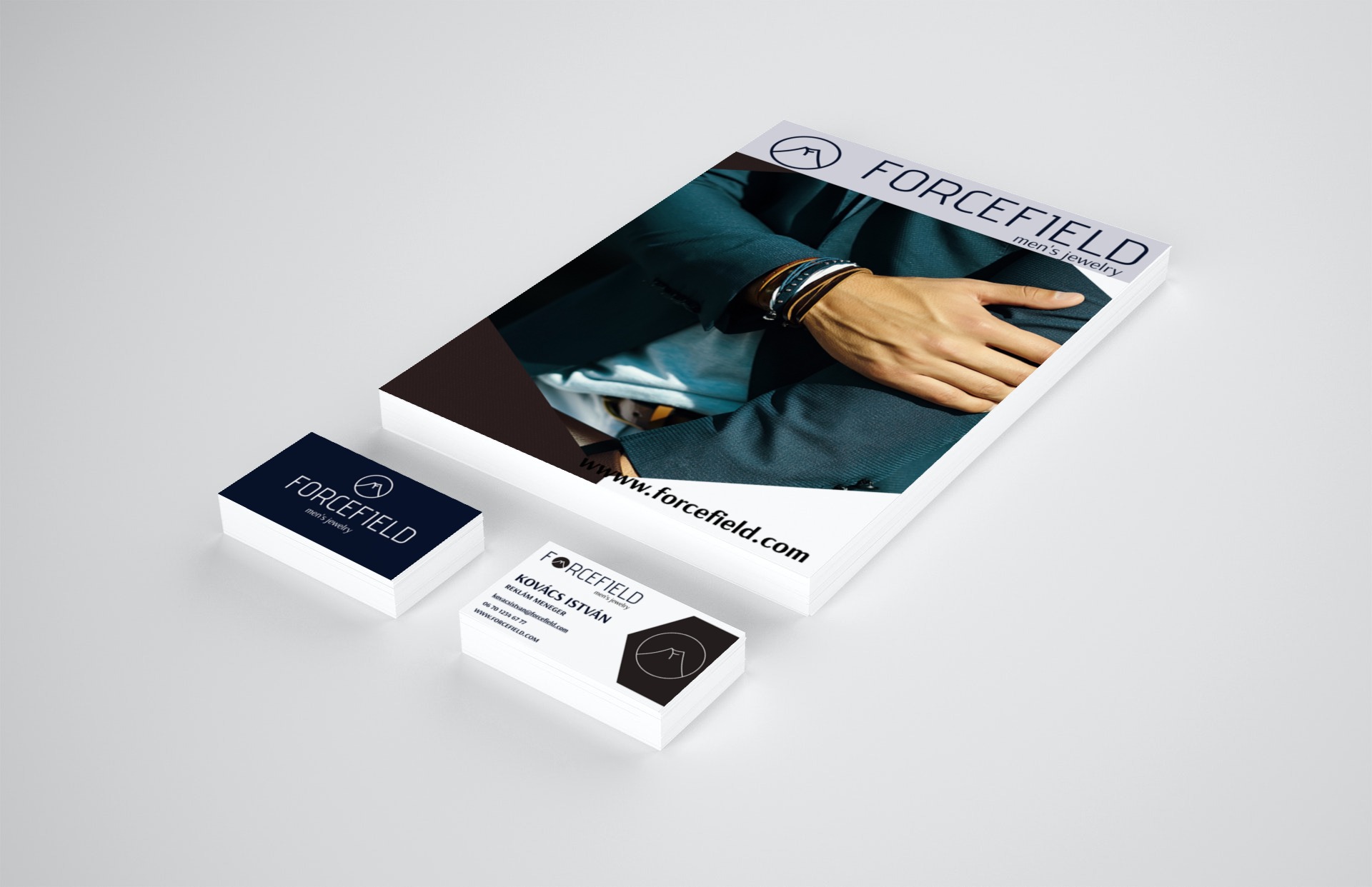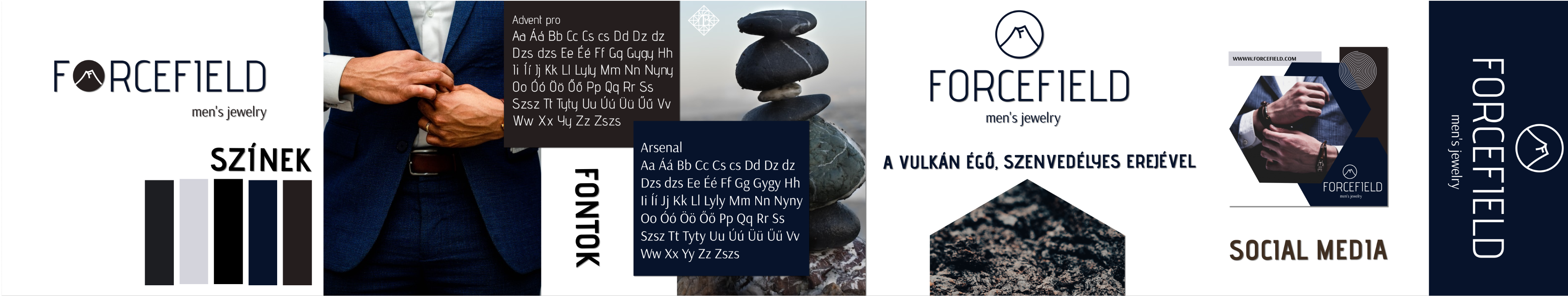ForceField is a men’s jewelry brand targeting individuals aged 30–50 who appreciate high-quality, handcrafted, and distinctive pieces. The visual identity uses dark, masculine tones of deep blue, brown, and snowy white, reflecting both power and refined elegance.