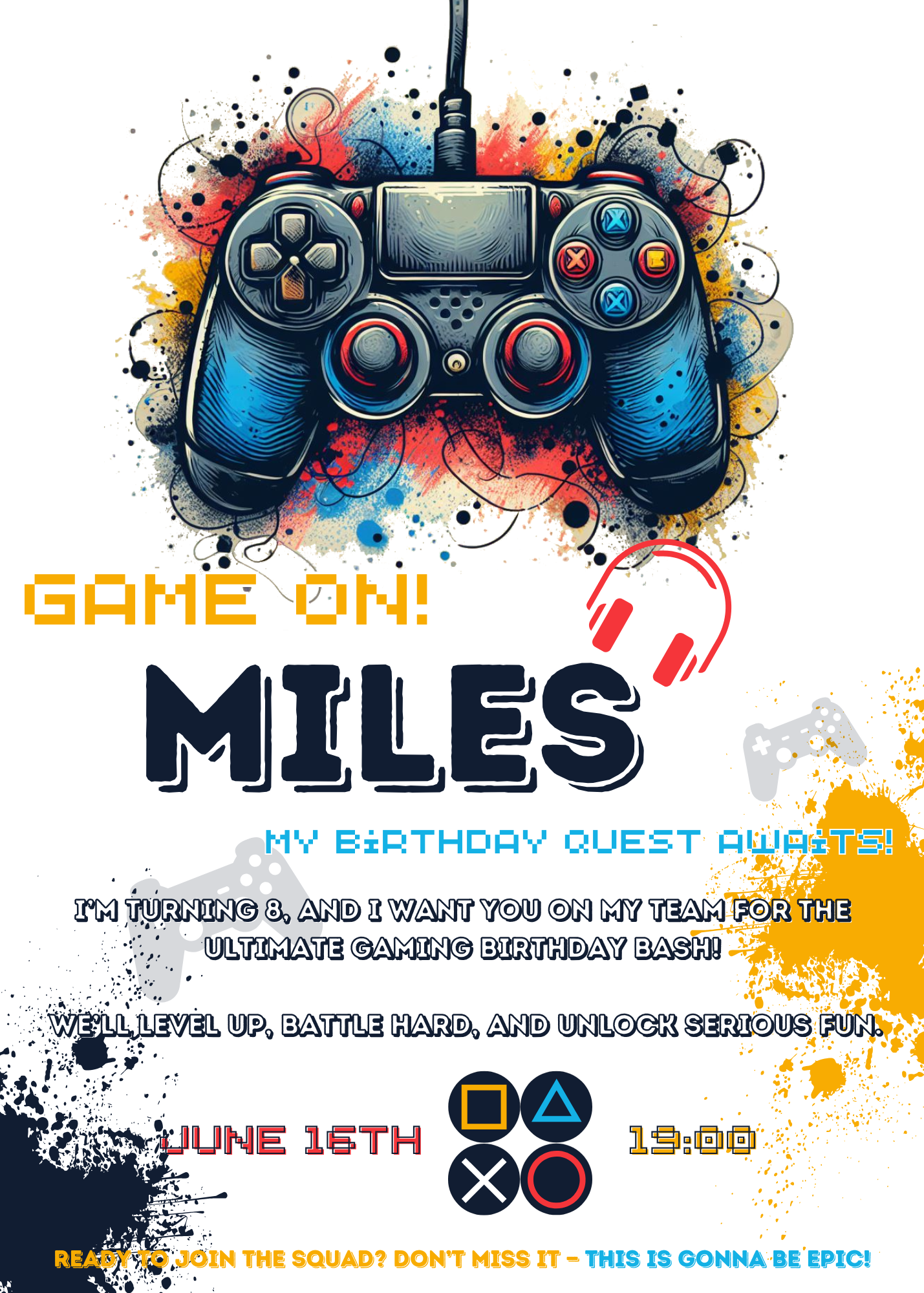 Level up your party with this action-packed gamer invitation! From the moment guests see it, they'll be ready to hit “start” on an unforgettable celebration.
